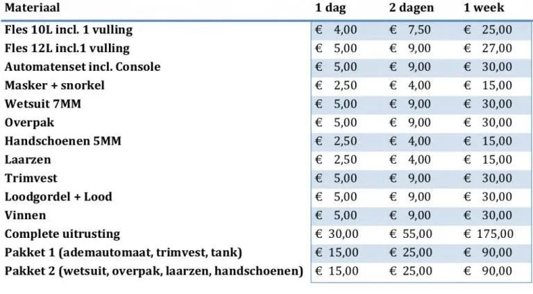Het is mogelijk om bij DiveWorld uitrusting te huren tegen speciaal tarief, zie hier onder alle prijzen in de tabel: